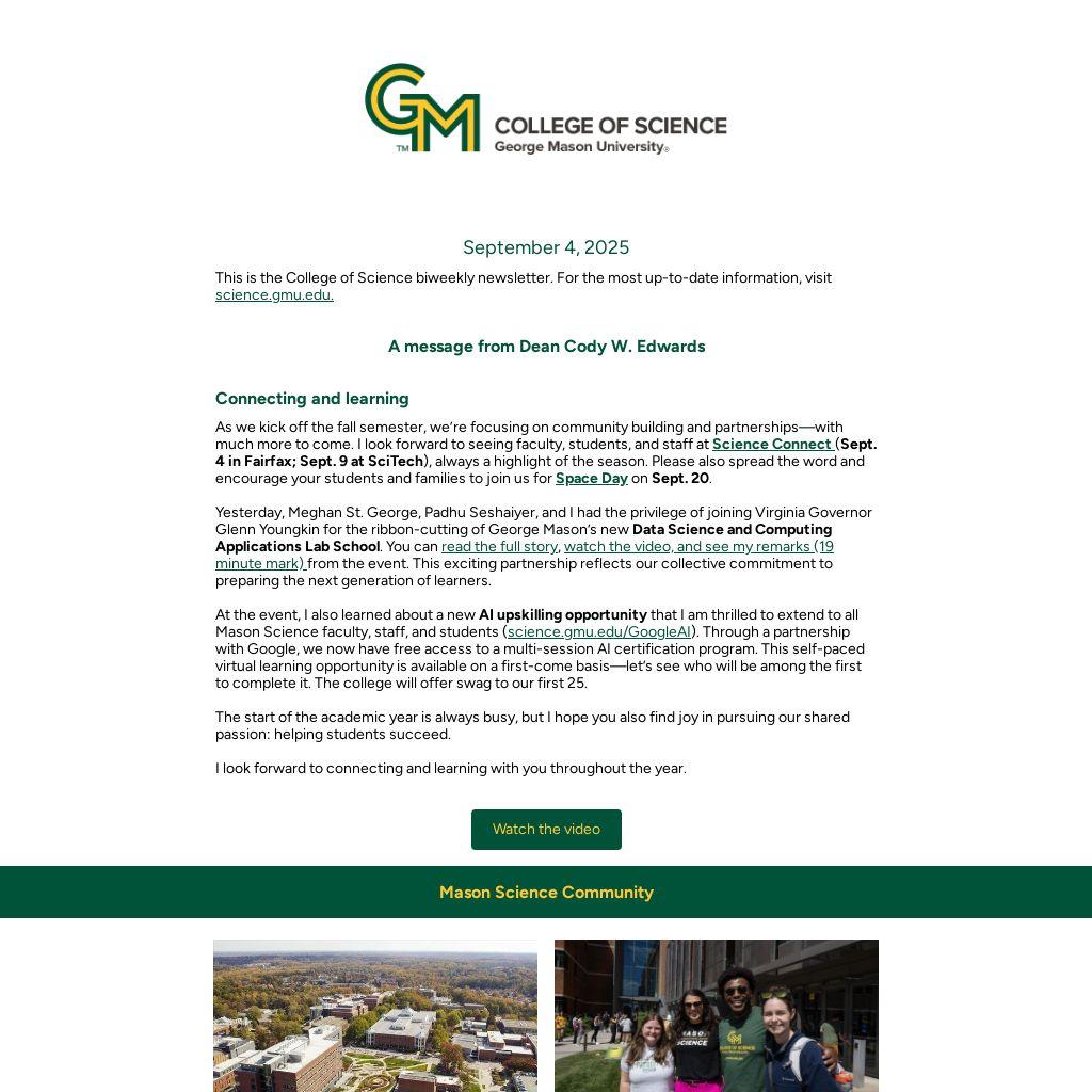 This is the College of Science biweekly newsletter. For the most up-to-date information, visit science.gmu.edu.
