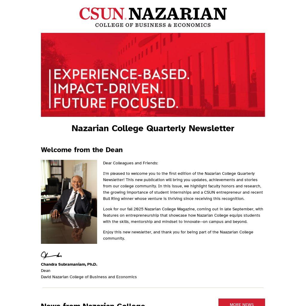 I'm pleased to welcome you to the first edition of the Nazarian College Quarterly Newsletter! This new publication will bring you updates, achievements and stories from our college community. In this issue, we highlight faculty honors and research, the growing importance of student internships and a CSUN entrepreneur and recent Bull Ring winner whose venture is thriving since receiving this recognition.