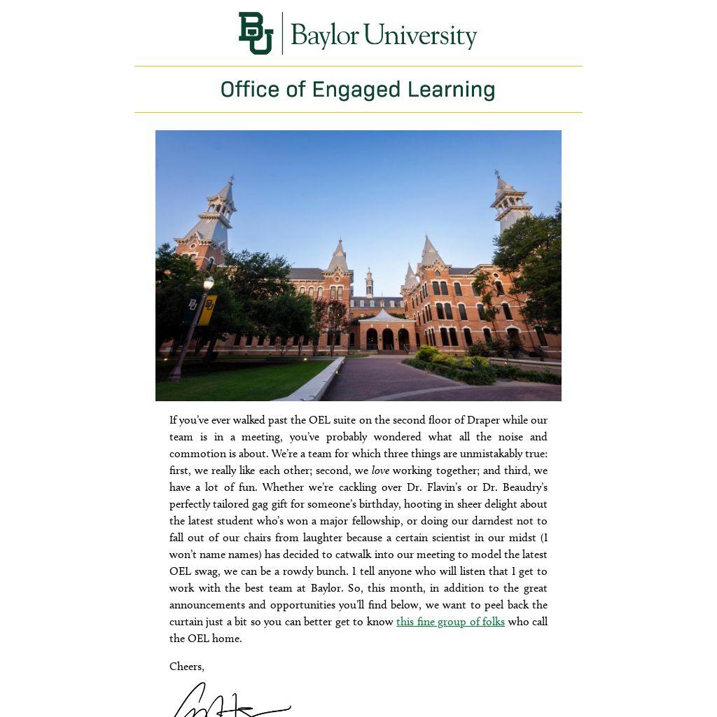 If you’ve ever walked past the OEL suite on the second floor of Draper while our team is in a meeting, you’ve probably wondered what all the noise and commotion is about. We’re a team for which three things are unmistakably true: first, we really like each other; second, we love working together; and third, we have a lot of fun. Whether we’re cackling over Dr. Flavin’s or Dr. Beaudry’s perfectly tailored gag gift for someone’s birthday, hooting in sheer delight about the latest student who’s won a major fellowship, or doing our darndest not to fall out of our chairs from laughter because a certain scientist in our midst (I won’t name names) has decided to catwalk into our meeting to model the latest OEL swag, we can be a rowdy bunch. I tell anyone who will listen that I get to work with the best team at Baylor. So, this month, in addition to the great announcements and opportunities you’ll find below, we want to peel back the curtain just a bit so you can better get to know this fine group of folks who call the OEL home.