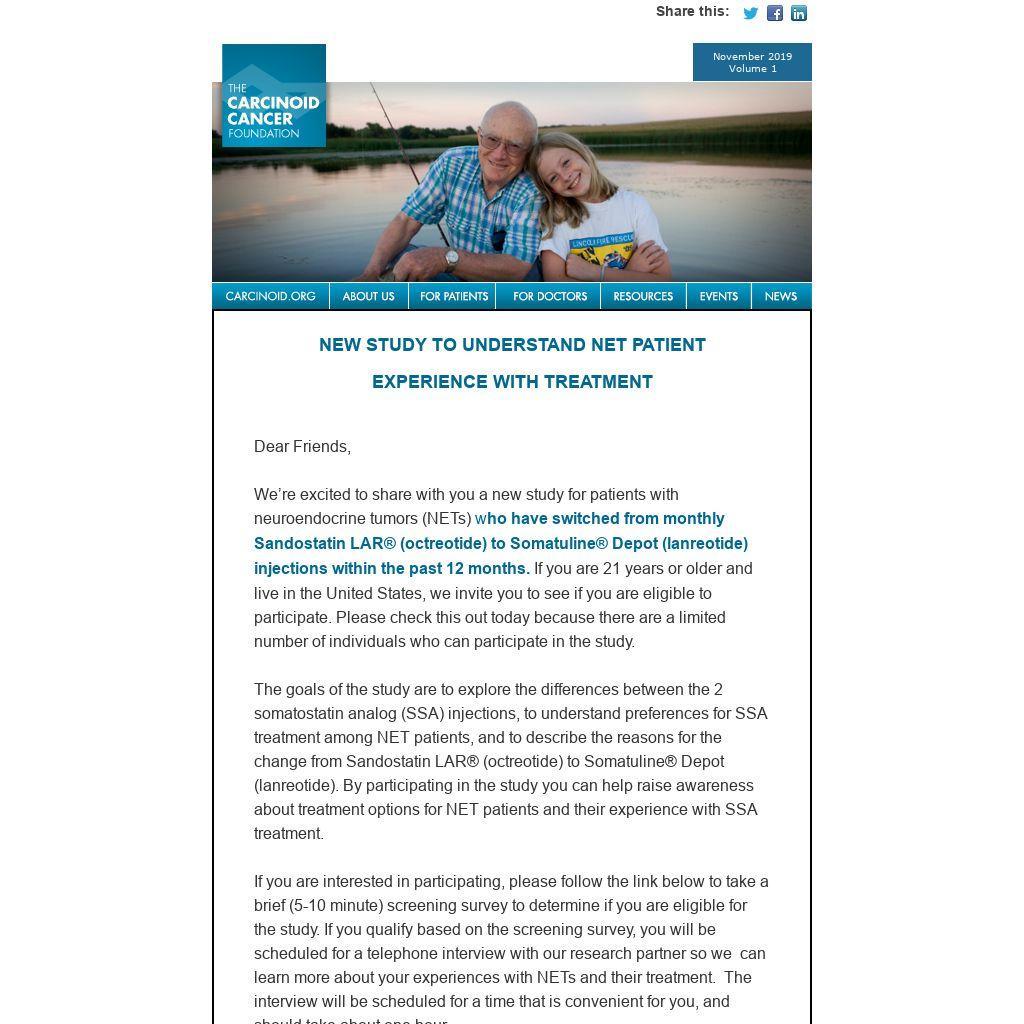 We’re excited to share with you a new study for patients with neuroendocrine tumors (NETs) who have switched from monthly Sandostatin LAR® (octreotide) to Somatuline® Depot (lanreotide) injections within the past 12 months. If you are 21 years or older and live in the United States, we invite you to see if you are eligible to participate. Please check this out today because there are a limited number of individuals who can participate in the study.