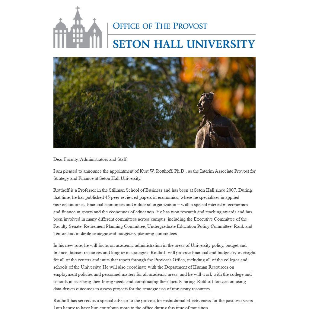 I am pleased to announce the appointment of Kurt W. Rotthoff, Ph.D., as the Interim Associate Provost for Strategy and Finance at Seton Hall University.