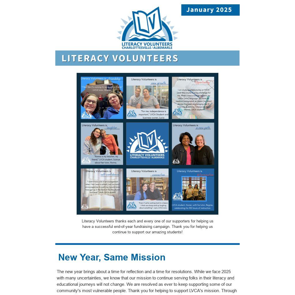 The new year brings about a time for reflection and a time for resolutions. While we face 2025 with many uncertainties, we know that our mission to continue serving folks in their literacy and educational journeys will not change. We are resolved as ever to keep supporting some of our community's most vulnerable people. Thank you for helping to support LVCA's mission. Through your generosity, as a donor, volunteer, or subscriber, you are helping keep our vital services in the Commonwealth.