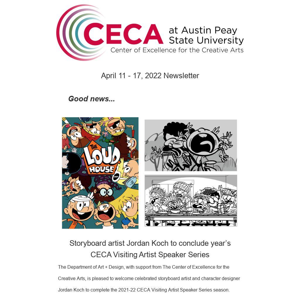Storyboard artist Jordan Koch to conclude year’s CECA Visiting Artist Speaker SeriesThe Department of Art + Design, with support from The Center of Excellence for the Creative Arts, is pleased to welcome celebrated storyboard artist and character designer Jordan Koch to complete the 2021-22 CECA Visiting Artist Speaker Series season.