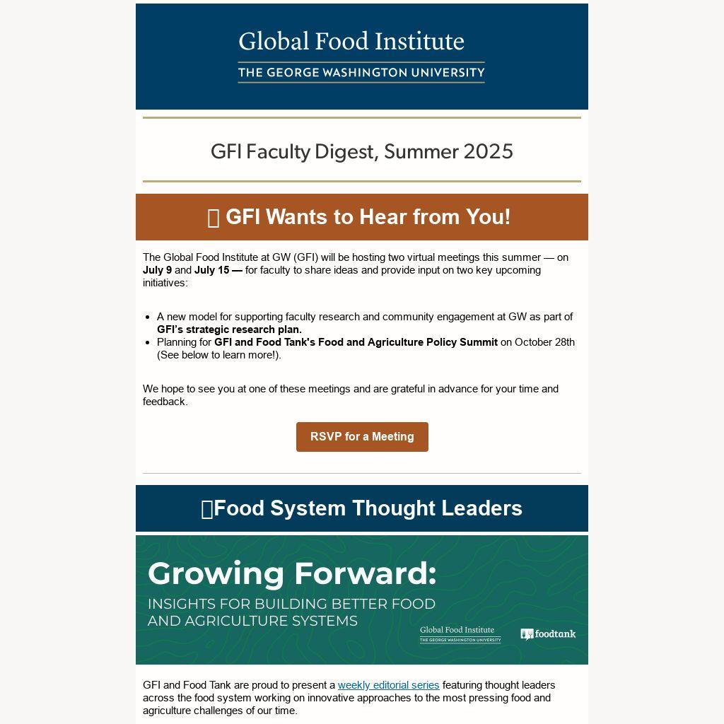 The Global Food Institute at GW (GFI) will be hosting two virtual meetings this summer — on July 9 and July 15 — for faculty to share ideas and provide input on two key upcoming initiatives: