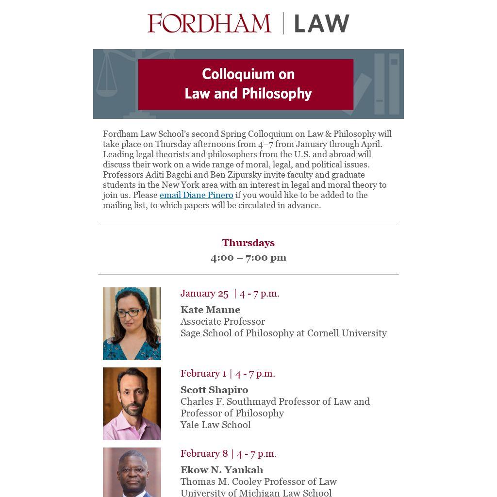 Fordham Law School’s second Spring Colloquium on Law & Philosophy will take place on Thursday afternoons from 4–7 from January through April. Leading legal theorists and philosophers from the U.S. and abroad will discuss their work on a wide range of moral, legal, and political issues. Professors Aditi Bagchi and Ben Zipursky invite faculty and graduate students in the New York area with an interest in legal and moral theory to join us. Please email Diane Pinero if you would like to be added to the mailing list, to which papers will be circulated in advance.