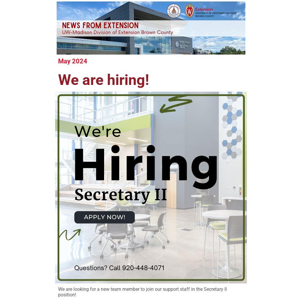 The Secretary II performs varied, detailed, and complex secretarial tasks for the University of Wisconsin Division of Extension (UW Extension Educators working in the areas of 4-H, Agriculture and Horticulture) calling for individual judgment, initiative, and applying specialized knowledge in performing duties regarding Extension Programming. In addition, the Secretary II works with volunteers and the public providing customer service.