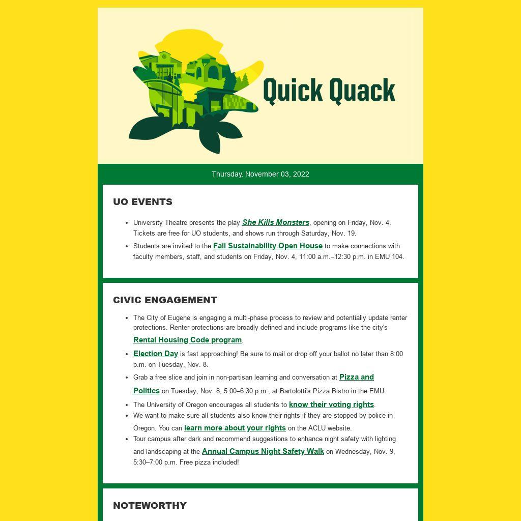 - University Theatre presents the play She Kills Monsters, opening on Friday, Nov. 4. Tickets are free for UO students, and shows run through Saturday, Nov. 19.