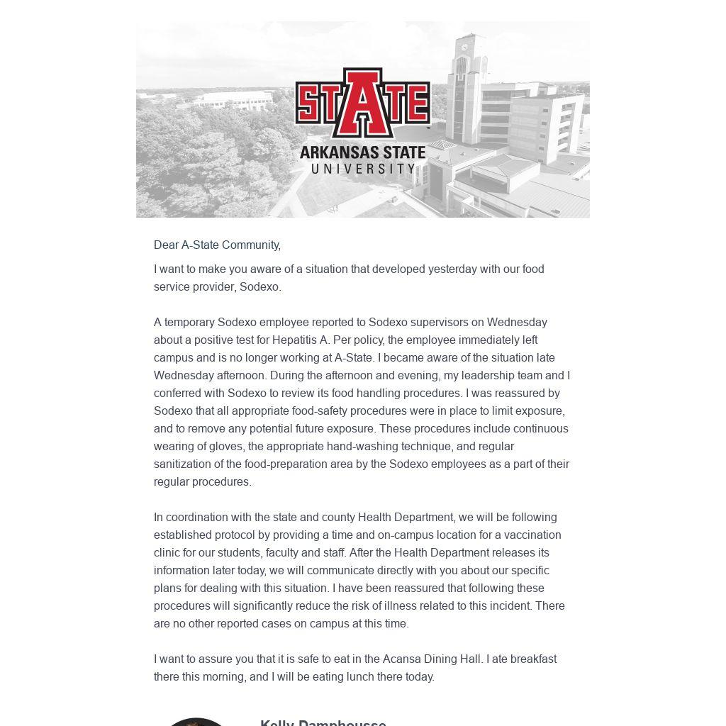 A temporary Sodexo employee reported to Sodexo supervisors on Wednesday about a positive test for Hepatitis A. Per policy, the employee immediately left campus and is no longer working at A-State. I became aware of the situation late Wednesday afternoon. During the afternoon and evening, my leadership team and I conferred with Sodexo to review its food handling procedures. I was reassured by Sodexo that all appropriate food-safety procedures were in place to limit exposure, and to remove any potential future exposure. These procedures include continuous wearing of gloves, the appropriate hand-washing technique, and regular sanitization of the food-preparation area by the Sodexo employees as a part of their regular procedures.