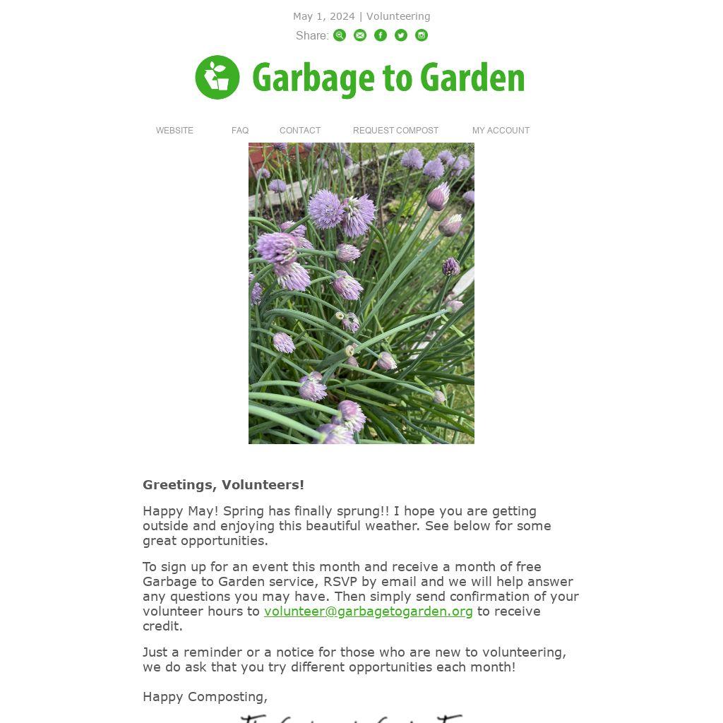 To sign up for an event this month and receive a month of free Garbage to Garden service, RSVP by email and we will help answer any questions you may have. Then simply send confirmation of your volunteer hours to volunteer@garbagetogarden.org to receive credit.
