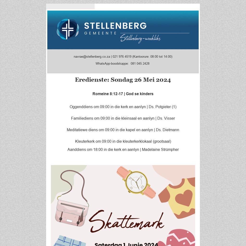 Jy kan gemeentenuus weekliks deur middel van die Stellenberg-weekliks per e-pos ontvang. Stuur jou e-posadres aan sanel@stellenberg.co.za. - Op jou selfoon: