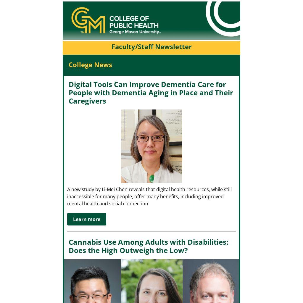The newsletter is sent to students each Thursday, and submissions are due by Tuesday at 5 pm to ensure they are included in that week’s edition. Any questions, please contact cph@gmu.edu.