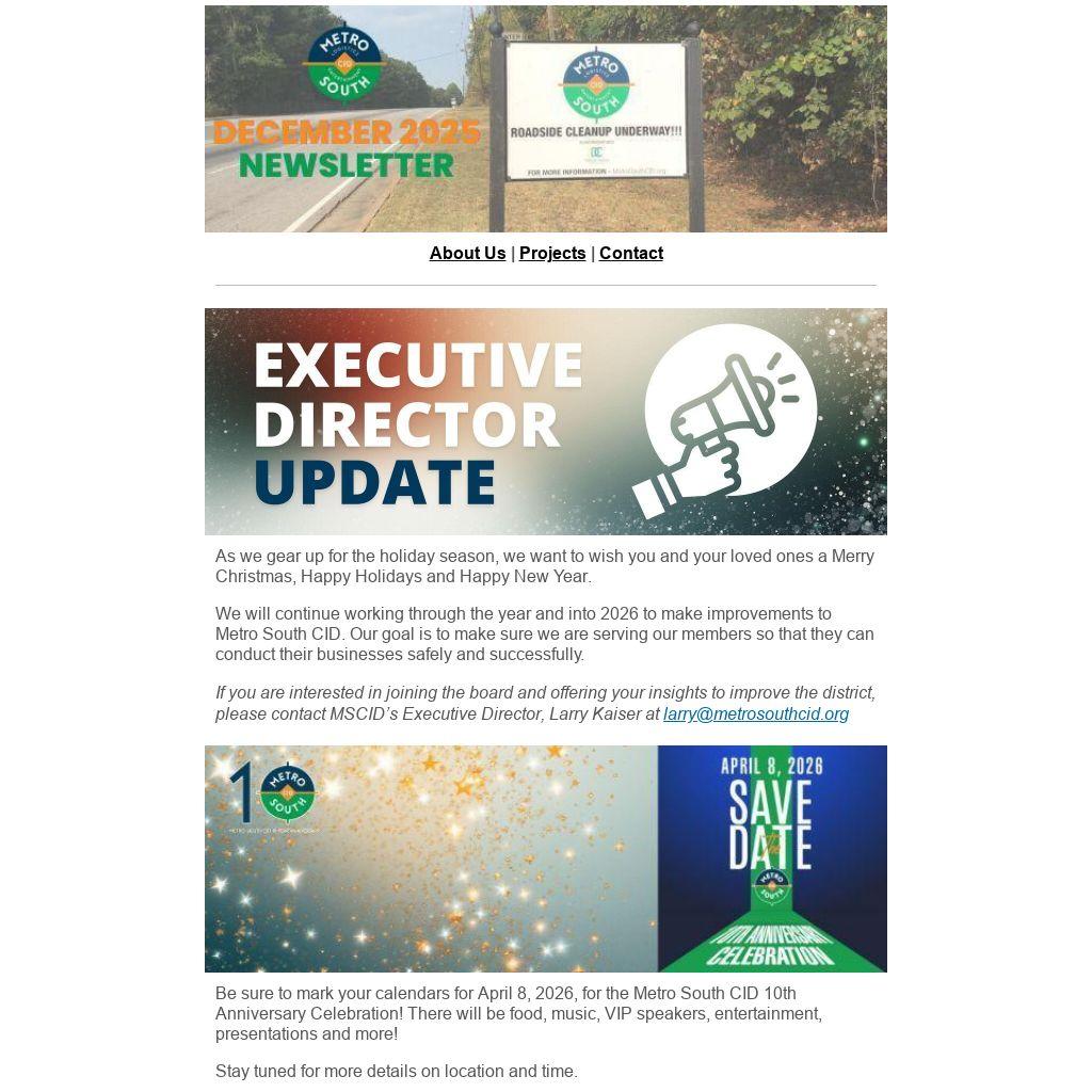 Be sure to mark your calendars for April 8, 2026, for the Metro South CID 10th Anniversary Celebration! There will be food, music, VIP speakers, entertainment, presentations and more!