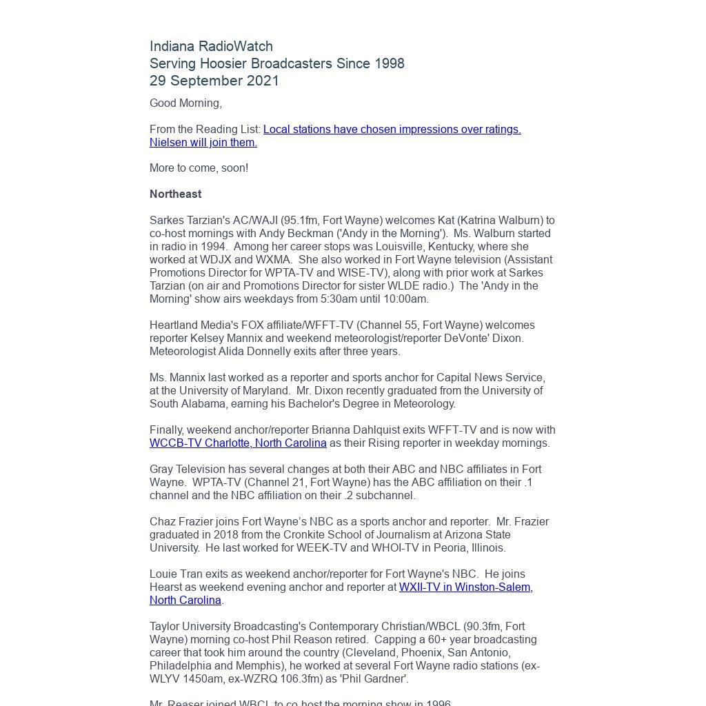 Indiana RadioWatch subscriptions are free. To subscribe, send an e-mail to irw@well.com and we'll add you. After publication, we archive Indiana RadioWatch on the Indiana Radio Archive at indianaradio.net. Please e-mail us your news stories and employment opportunities.