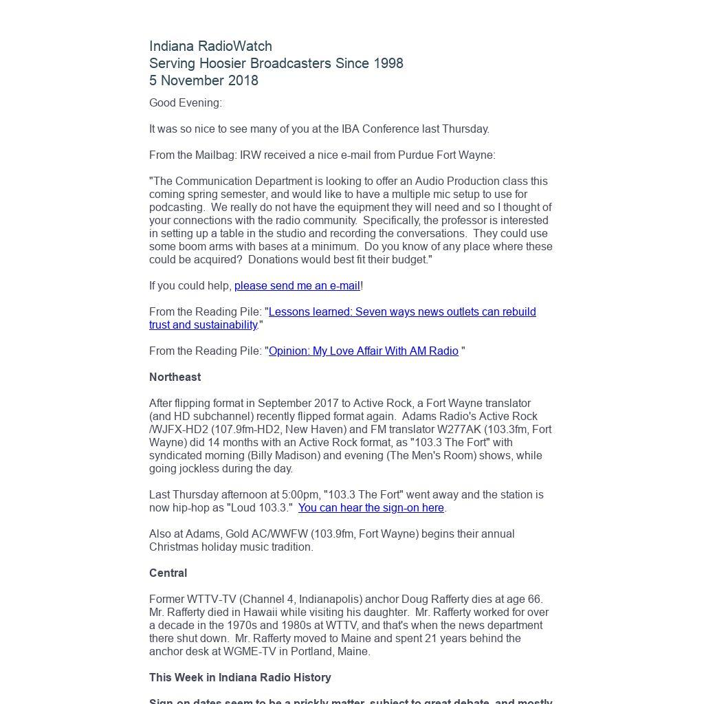Indiana RadioWatch subscriptions are free. To subscribe, send an e-mail to irw@well.com and we'll add you. After publication, we archive Indiana RadioWatch on the Indiana Radio Archive at http://www.indianaradio.net. Please e-mail us your news stories and employment opportunities.