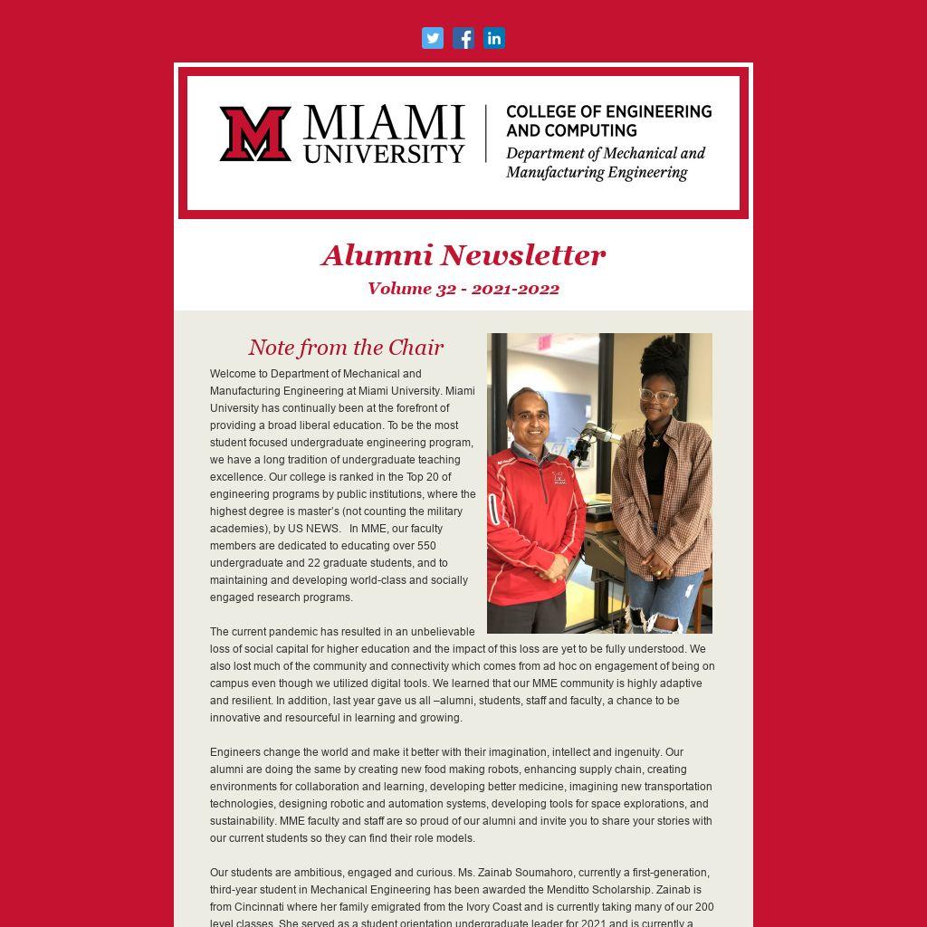 We need your help as MME alums and friends to create a diverse and inclusive climate for graduating future engineers. I thank you for your support of MME. Please contact our department at (513) 529-0710 or mmedept@miamioh.edu if you would like additional information about our programs.