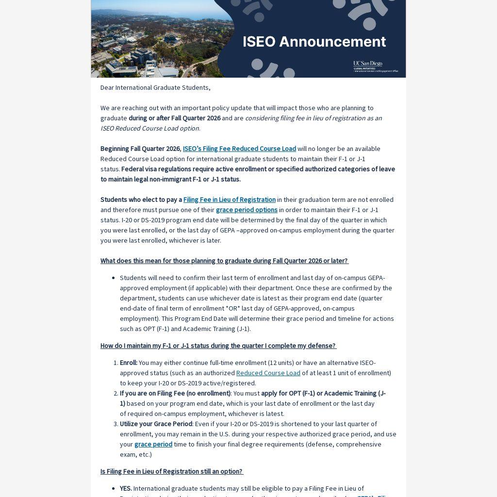 We understand this may impact your academic planning this fall. We encourage all students who are considering a Filing Fee in Lieu of Registration for the Fall 2026 quarter and beyond to discuss your academic plan with your department and consult with an ISEO advisor as needed.