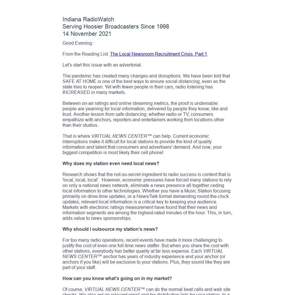 Indiana RadioWatch subscriptions are free. To subscribe, send an e-mail to irw@well.com and we'll add you. After publication, we archive Indiana RadioWatch on the Indiana Radio Archive at indianaradio.net. Please e-mail us your news stories and employment opportunities.