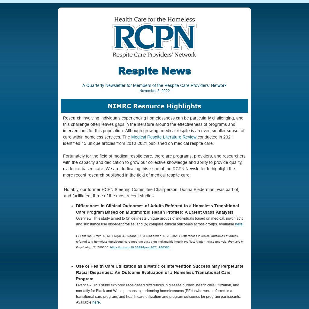 Fortunately for the field of medical respite care, there are programs, providers, and researchers with the capacity and dedication to grow our collective knowledge and ability to provide quality, evidence-based care. We are dedicating this issue of the RCPN Newsletter to highlight the more recent research published in the field of medical respite care.