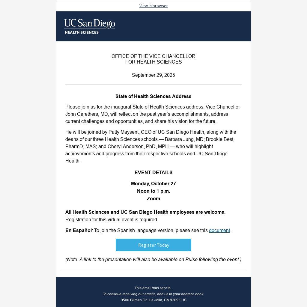 All Health Sciences and UC San Diego Health employees are welcome. Registration for this virtual event is required.