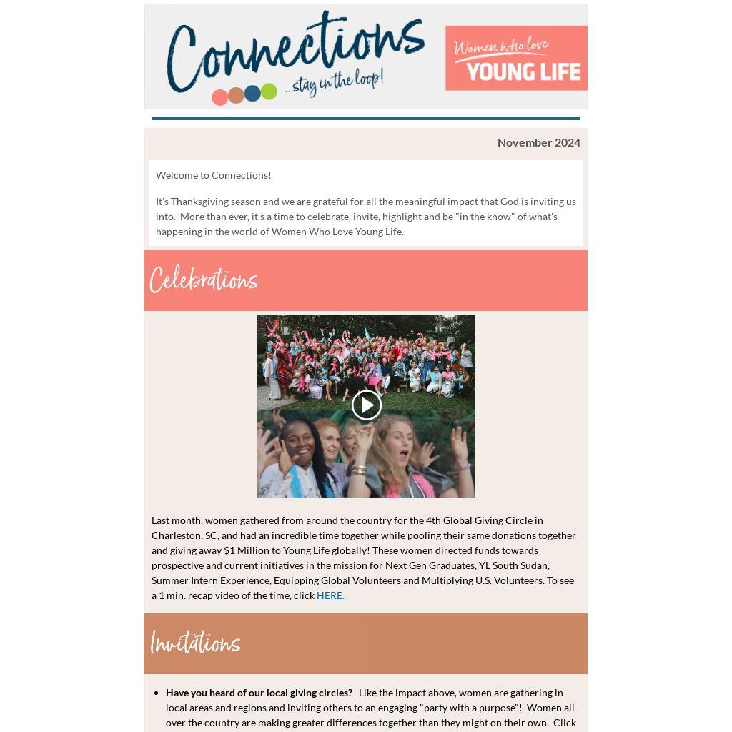 It's Thanksgiving season and we are grateful for all the meaningful impact that God is inviting us into. More than ever, it's a time to celebrate, invite, highlight and be "in the know" of what's happening in the world of Women Who Love Young Life.