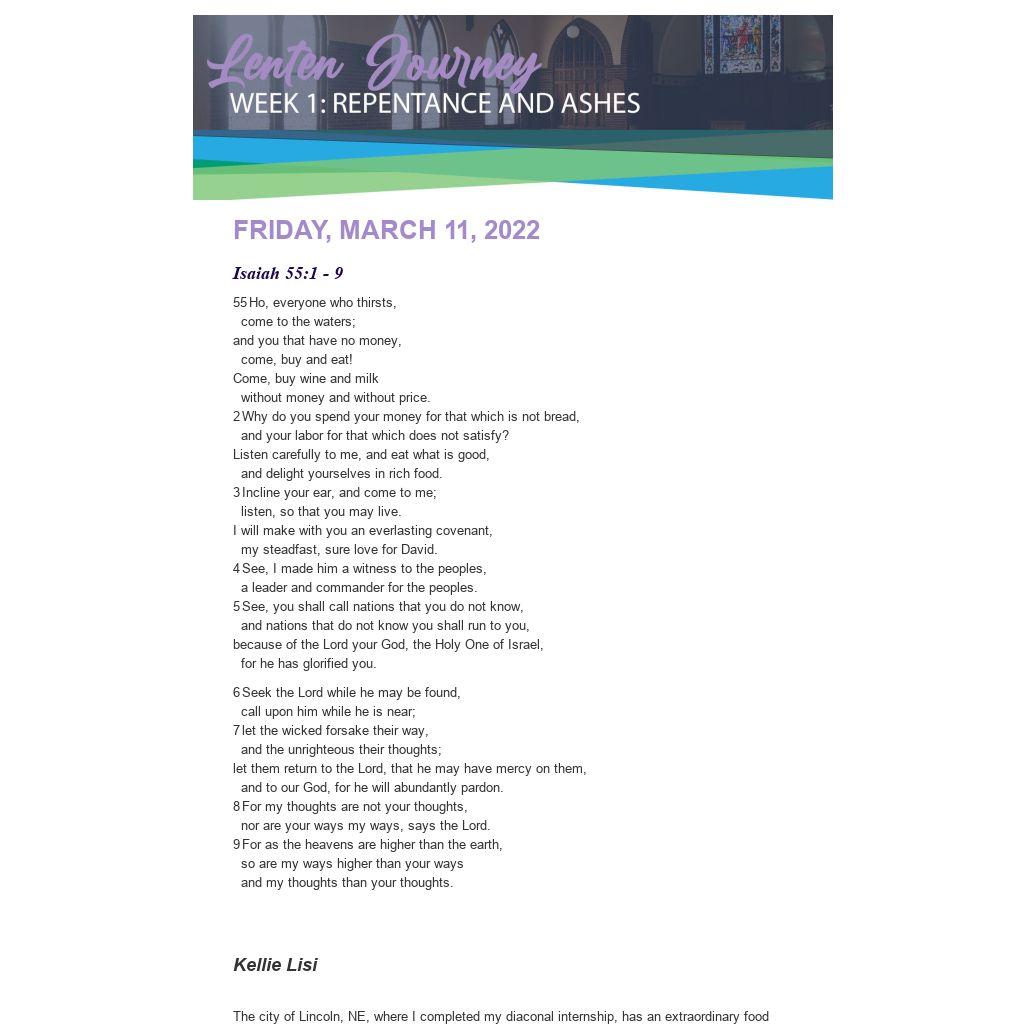 In repentance we open ourselves to the understanding that our ways are not the way of God, that our thoughts are not the thoughts of God. In repentance we are oriented again to our God who loves us, our God with whom there is always enough. In a world that focuses on scarcity and empty tables, God’s way is the tables full of food, with an abundance that remains even after each person has eaten their fill.