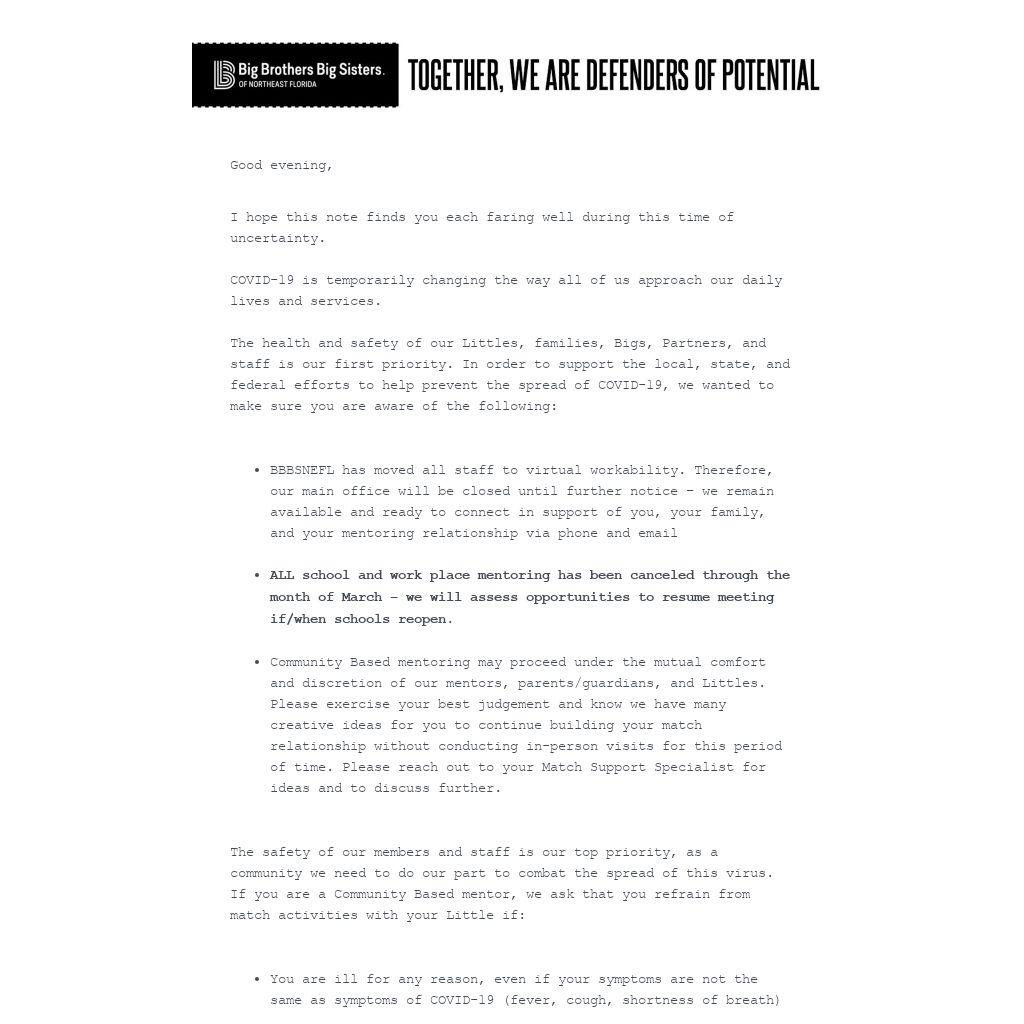 The health and safety of our Littles, families, Bigs, Partners, and staff is our first priority. In order to support the local, state, and federal efforts to help prevent the spread of COVID-19, we wanted to make sure you are aware of the following: