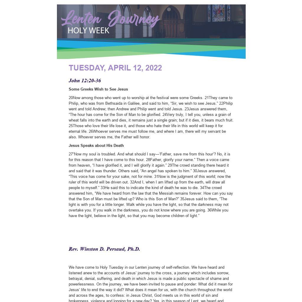 We have come to Holy Tuesday in our Lenten journey of self-reflection. We have heard and listened anew to the accounts of Jesus’ journey to the cross, a journey which includes sorrow, betrayal, denial, suffering, and death in which Jesus is made a public spectacle of shame and powerlessness. On the journey, we have been invited to pause and ponder: What did it mean for Jesus’ life to end the way it did? What does it mean for us, with the church throughout the world and across the ages, to confess: in Jesus Christ, God meets us in this world of sin and brokenness, violence and longing for a new day? Yes, in this season of Lent, we heard and continue to hear about God’s unconditional love for us, for the world.