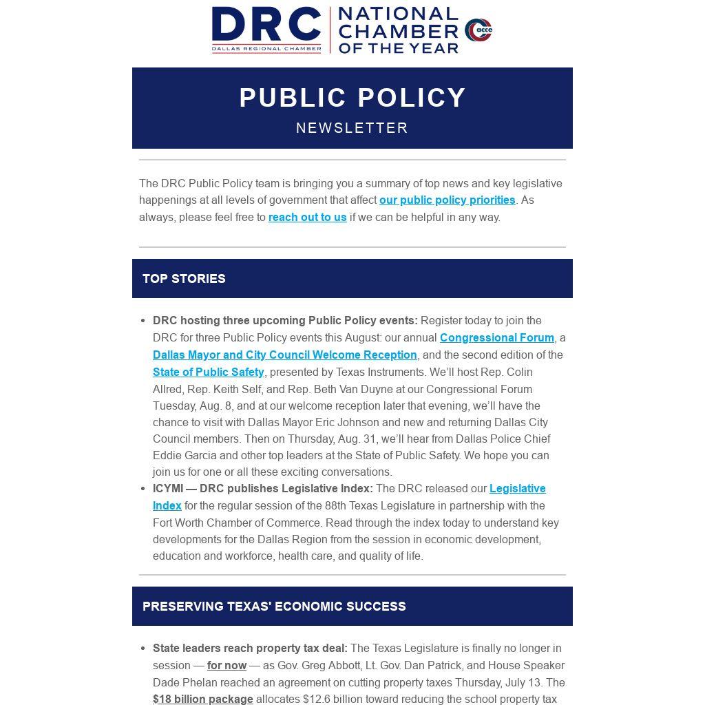 DRC hosting three upcoming Public Policy events: Register today to join the DRC for three Public Policy events this August: our annual Congressional Forum, a Dallas Mayor and City Council Welcome Reception, and the second edition of the State of Public Safety, presented by Texas Instruments. We’ll host Rep. Colin Allred, Rep. Keith Self, and Rep. Beth Van Duyne at our Congressional Forum Tuesday, Aug. 8, and at our welcome reception later that evening, we’ll have the chance to visit with Dallas Mayor Eric Johnson and new and returning Dallas City Council members. Then on Thursday, Aug. 31, we’ll hear from Dallas Police Chief Eddie Garcia and other top leaders at the State of Public Safety. We hope you can join us for one or all these exciting conversations.