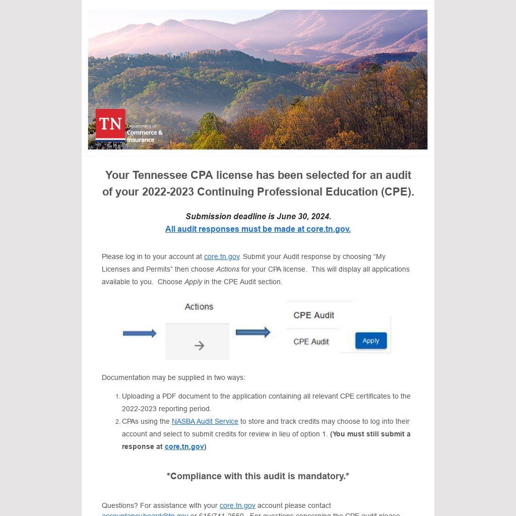 Questions? For assistance with your core.tn.gov account please contact accountancy.board@tn.gov or 615/741-2550. For questions concerning the CPE audit please email accountancy.forms@tn.gov.