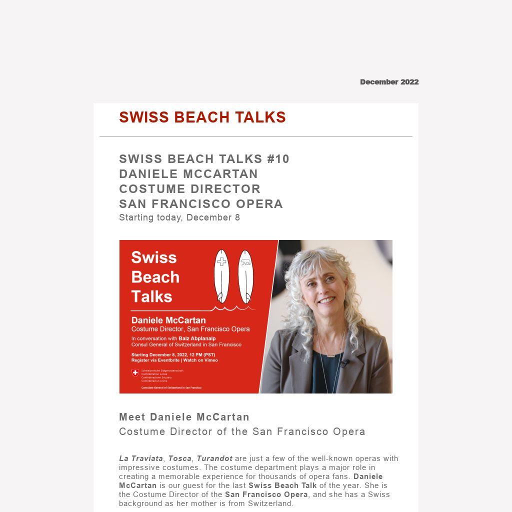 La Traviata, Tosca, Turandot are just a few of the well-known operas with impressive costumes. The costume department plays a major role in creating a memorable experience for thousands of opera fans. Daniele McCartan is our guest for the last Swiss Beach Talk of the year. She is the Costume Director of the San Francisco Opera, and she has a Swiss background as her mother is from Switzerland.