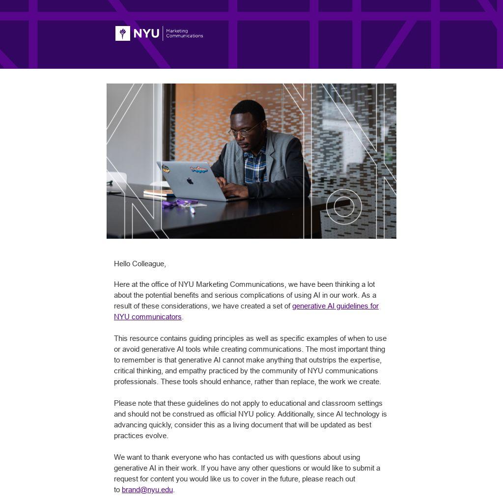 This resource contains guiding principles as well as specific examples of when to use or avoid generative AI tools while creating communications. The most important thing to remember is that generative AI cannot make anything that outstrips the expertise, critical thinking, and empathy practiced by the community of NYU communications professionals. These tools should enhance, rather than replace, the work we create.