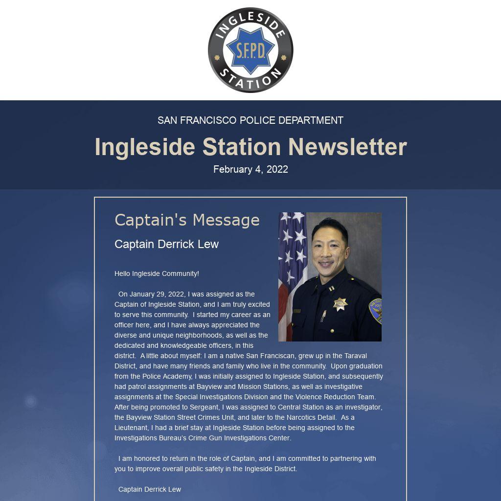 I am honored to return in the role of Captain, and I am committed to partnering with you to improve overall public safety in the Ingleside District.