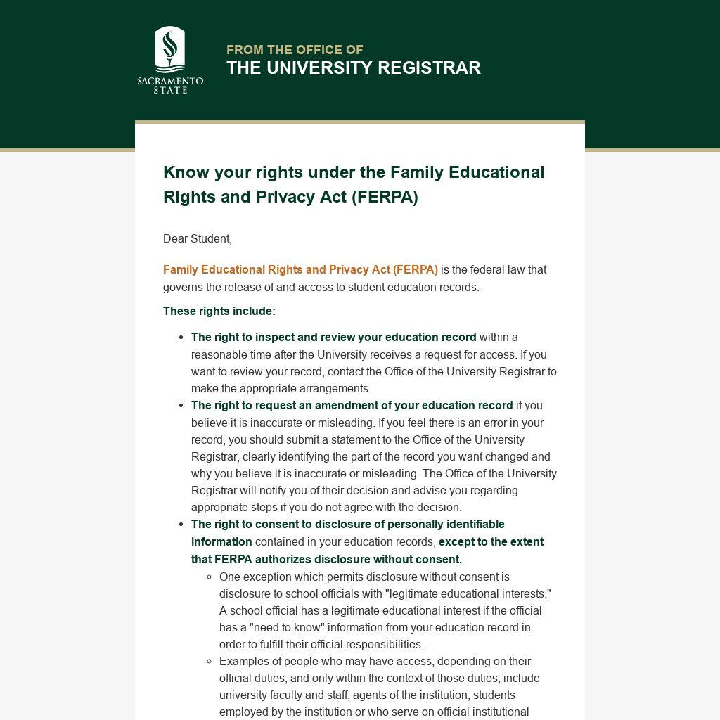 Sacramento State does not generally release of student record information without the expressed, written consent of the student; however, there are some exceptions.