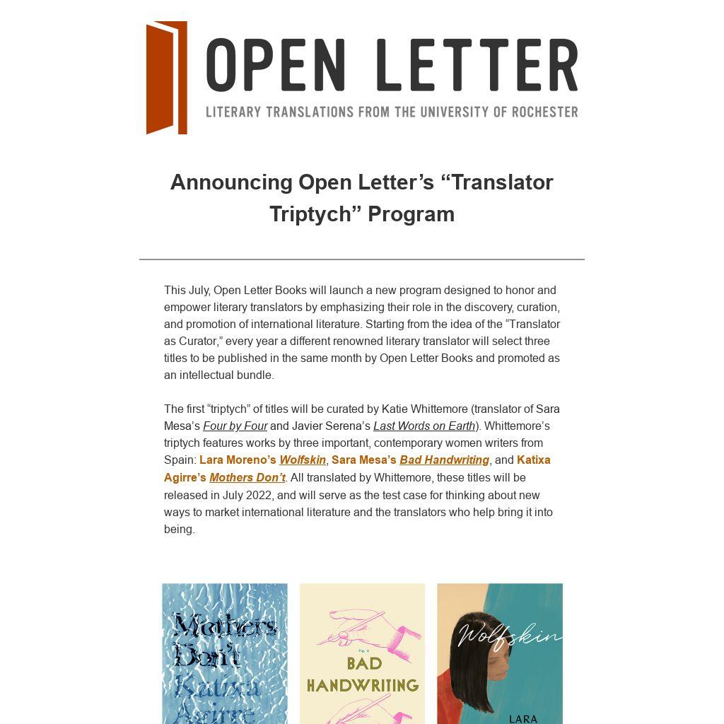 “We translators often wear various in hats during the process of bringing a work of literature into English. We advocate for the books and the authors, connect with agents, prepare samples and reader’s reports—often for little or no pay—scout the literary field in our respective languages, and serve, in a sense, as experts and consultants for the publishers we work with. Ultimately, we can really have an impact on their list,” says Whittemore. “This triptych project highlights a lot of that background work that usually goes unrecognized when the book is published. Having a central role in selecting, translating, and introducing these titles to readers will hopefully open doors for me—and other translators— to continue curating books we love for Open Letter and other presses.”