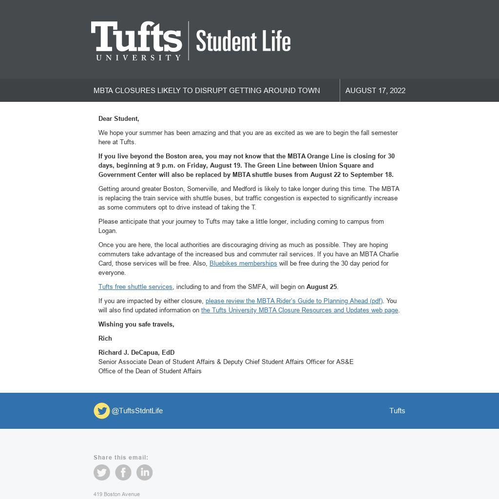 Please anticipate that your journey to Tufts may take a little longer, including coming to campus from Logan.