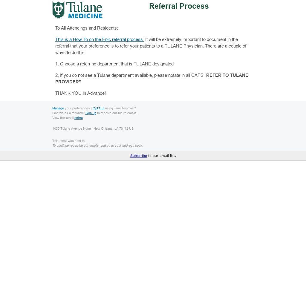 This is a How-To on the Epic referral process. It will be extremely important to document in the referral that your preference is to refer your patients to a TULANE Physician. There are a couple of ways to do this.