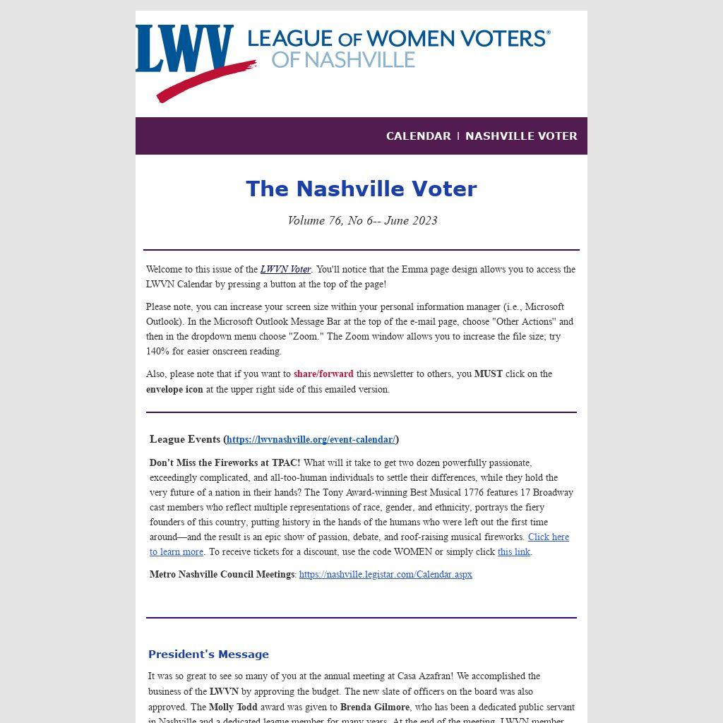 ATTENTION: The Nashville Voter is a digital publication. If you have received this copy of the Voter in the mail, it means the League of Women Voters of Nashville does not have an e-mail address for you. Please help us by sending your e-mail address to LWVNash@gmail.com. Being on the LWVN e-mail database ensures your receipt of all LWVN newsletters, event invitations, meeting announcements, and Call to Action alerts.