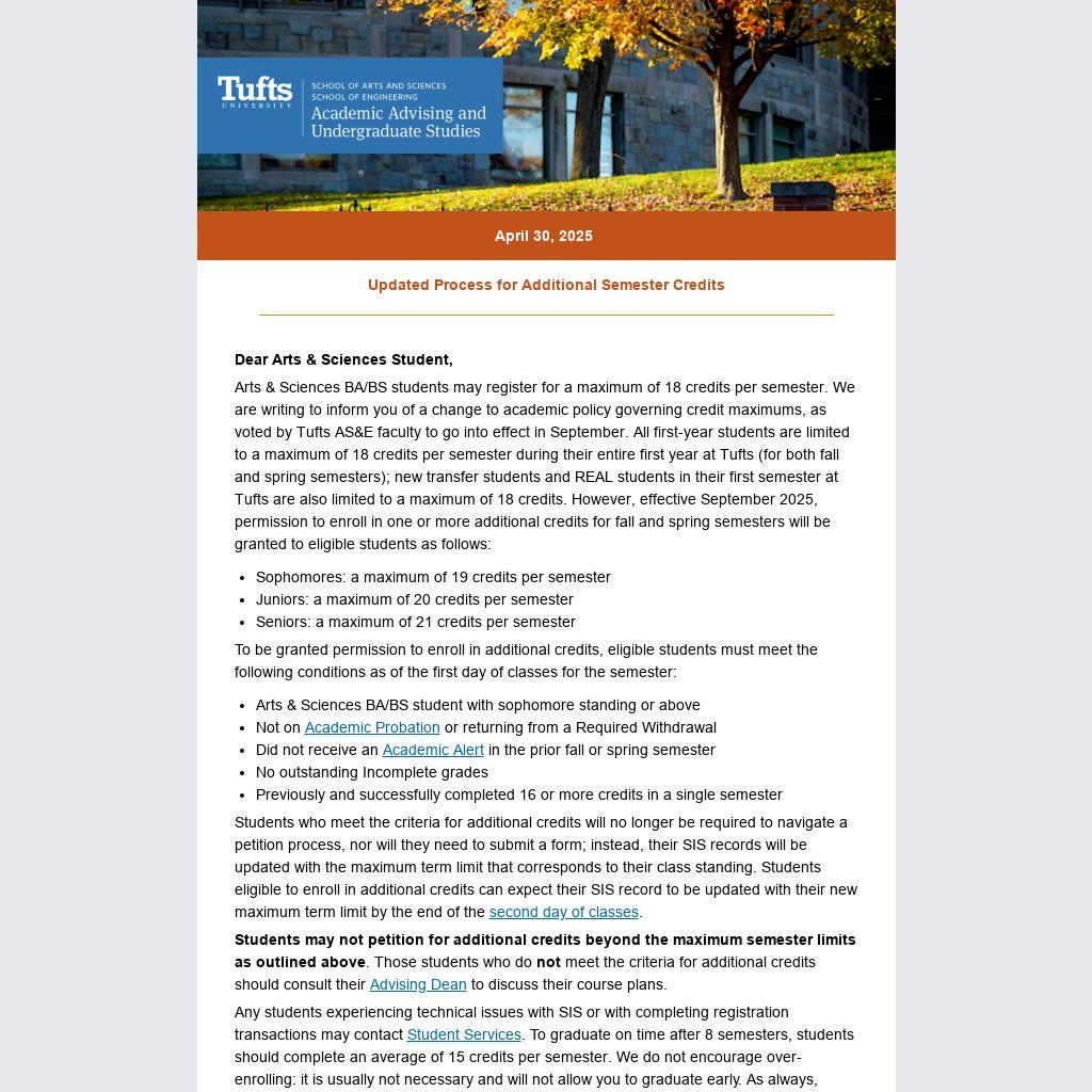 Any students experiencing technical issues with SIS or with completing registration transactions may contact Student Services. To graduate on time after 8 semesters, students should complete an average of 15 credits per semester. We do not encourage over-enrolling: it is usually not necessary and will not allow you to graduate early. As always, students are reminded to consider their academic residency requirement, which stipulates a minimum completion of 8 semesters of full-time study at Tufts, regardless of progression with cumulative credits.