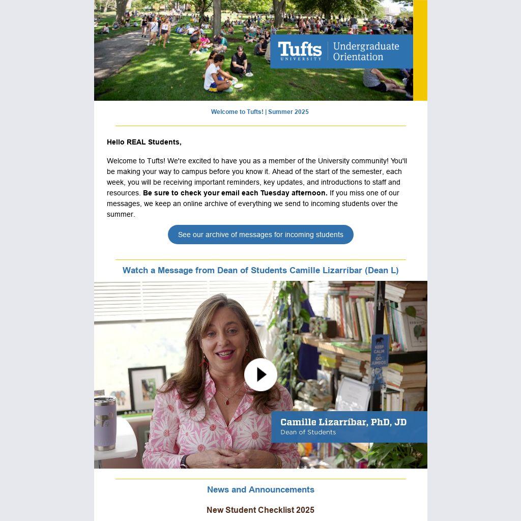 Welcome to Tufts! We're excited to have you as a member of the University community! You'll be making your way to campus before you know it. Ahead of the start of the semester, each week, you will be receiving important reminders, key updates, and introductions to staff and resources. Be sure to check your email each Tuesday afternoon. If you miss one of our messages, we keep an online archive of everything we send to incoming students over the summer.