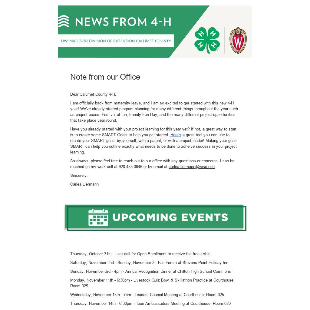 As always, please feel free to reach out to our office with any questions or concerns. I can be reached on my work cell at 920-483-0646 or by email at carlea.liermann@wisc.edu.