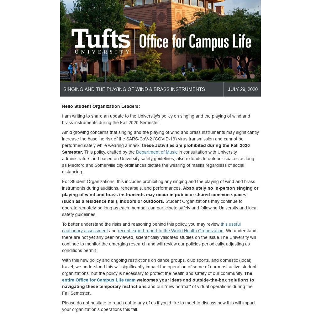 Amid growing concerns that singing and the playing of wind and brass instruments may significantly increase the baseline risk of the SARS-CoV-2 (COVID-19) virus transmission and cannot be performed safely while wearing a mask, these activities are prohibited during the Fall 2020 Semester. This policy, drafted by the Department of Music in consultation with University administrators and based on University safety guidelines, also extends to outdoor spaces as long as Medford and Somerville city ordinances dictate the wearing of masks regardless of social distancing.
