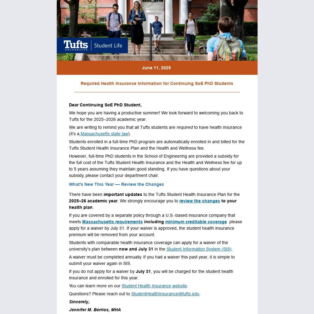 There have been important updates to the Tufts Student Health Insurance Plan for the 2025–26 academic year. We strongly encourage you to review the changes to your health plan.