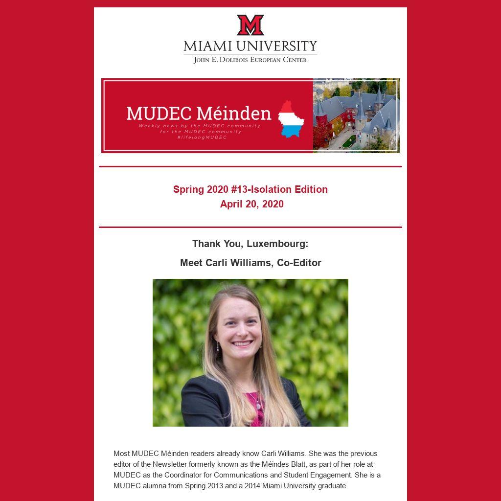 Most MUDEC Méinden readers already know Carli Williams. She was the previous editor of the Newsletter formerly known as the Méindes Blatt, as part of her role at MUDEC as the Coordinator for Communications and Student Engagement. She is a MUDEC alumna from Spring 2013 and a 2014 Miami University graduate.