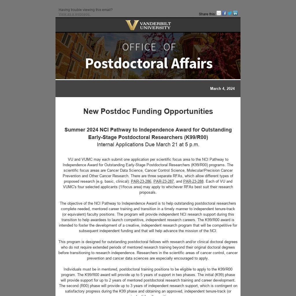 VU and VUMC may each submit one application per scientific focus area to the NCI Pathway to Independence Award for Outstanding Early-Stage Postdoctoral Researchers (K99/R00) programs. The scientific focus areas are Cancer Data Science, Cancer Control Science, Molecular/Precision Cancer Prevention and Other Cancer Research. There are three separate RFAs, which allow different types of proposed research (e.g. basic, clinical): PAR-23-286, PAR-23-287, and PAR-23-288. Each of VU and VUMC's four selected applicants (1/focus area) may apply to whichever RFAs best suit their research proposals.
