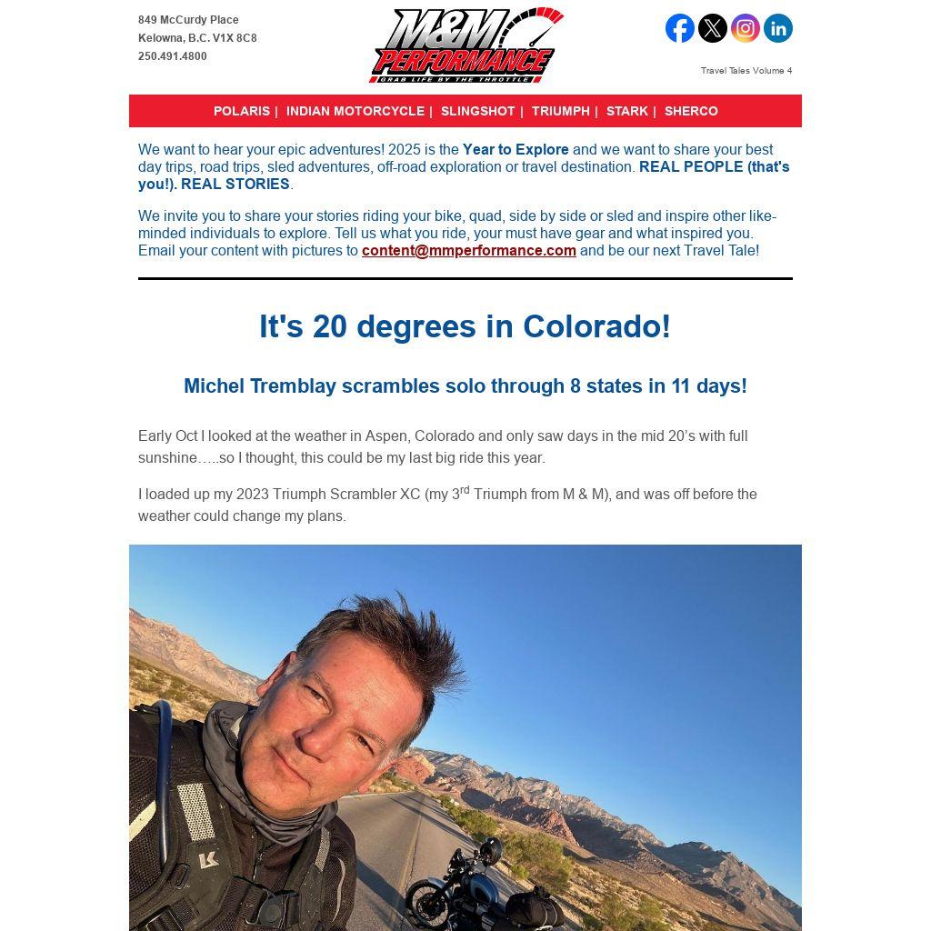 We invite you to share your stories riding your bike, quad, side by side or sled and inspire other like-minded individuals to explore. Tell us what you ride, your must have gear and what inspired you. Email your content with pictures to content@mmperformance.com and be our next Travel Tale!