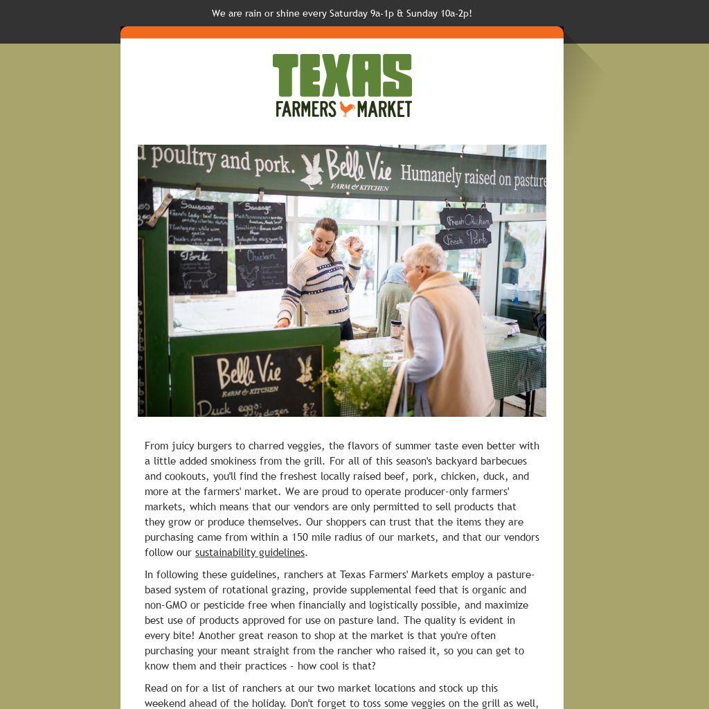 In following these guidelines, ranchers at Texas Farmers' Markets employ a pasture-based system of rotational grazing, provide supplemental feed that is organic and non-GMO or pesticide free when financially and logistically possible, and maximize best use of products approved for use on pasture land. The quality is evident in every bite! Another great reason to shop at the market is that you're often purchasing your meant straight from the rancher who raised it, so you can get to know them and their practices - how cool is that?