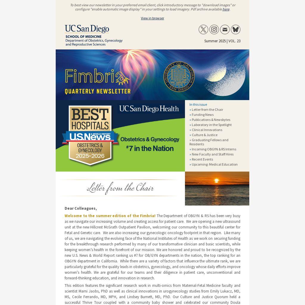 Welcome to the summer edition of the Fimbria! The Department of OBGYN & RS has been very busy as we navigate our increasing volume and creating access for patient care. We are opening a new ultrasound unit at the new Hillcrest McGrath Outpatient Pavilion, welcoming our community to this beautiful center for Fetal and Genetic care. We are also increasing our gynecologic oncology footprint in that region. Like many of us, we are navigating the evolving face of the National Institutes of Health as we work on securing funding for the breakthrough research performed by many of our transformative clinician and basic scientists, while keeping women’s health in the forefront of our mission. We are honored and proud to be recognized by the new U.S. News & World Report ranking us #7 for OB/GYN departments in the nation, the top ranking for an OBGYN department in California. While there are a variety of factors that influence the ultimate rank, we are particularly grateful for the quality leads in obstetrics, gynecology, and oncology whose daily efforts improve women's health. We are grateful for our teams and their diligence in patient care, unconventional and forward-thinking education, and innovation in research.