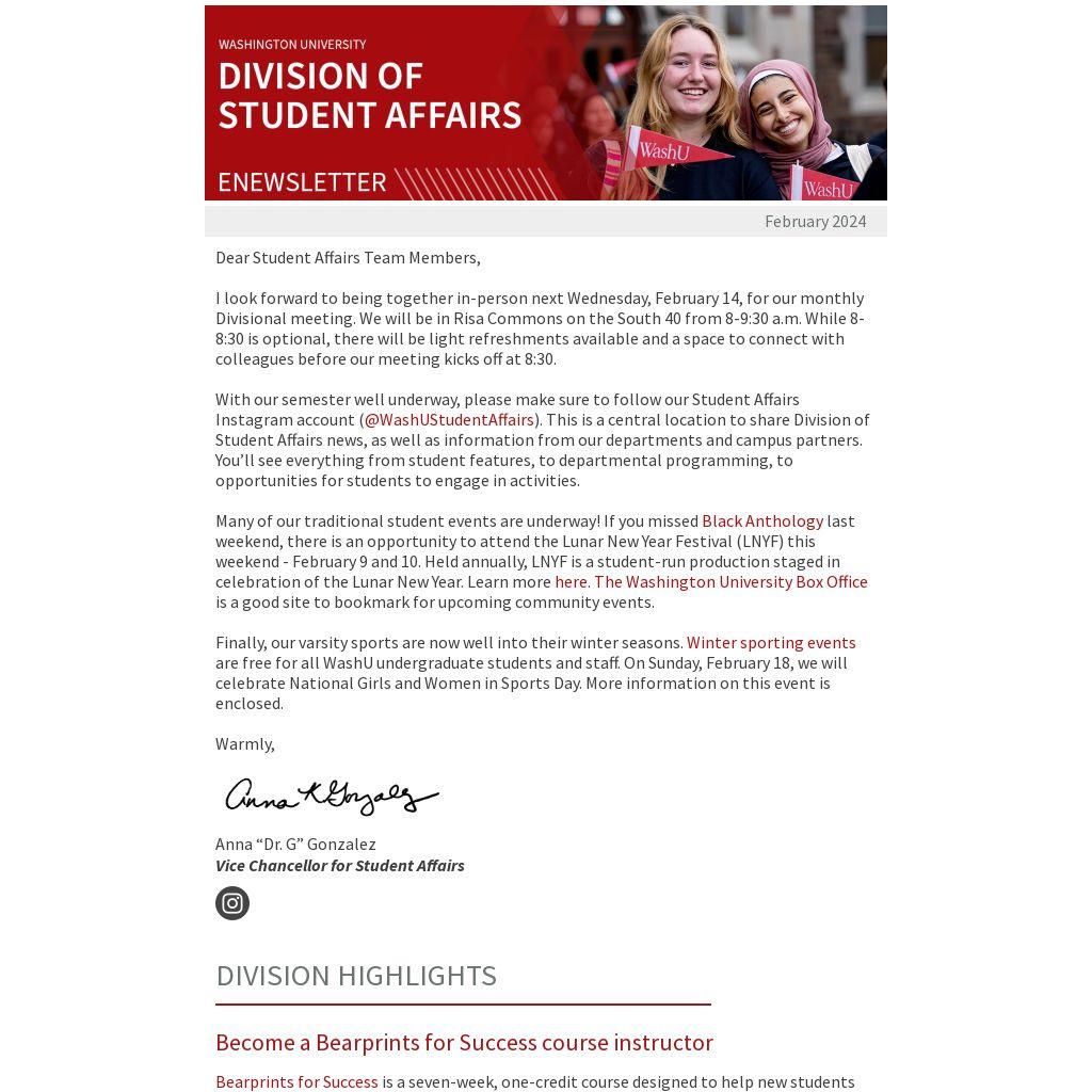 Finally, our varsity sports are now well into their winter seasons. Winter sporting events are free for all WashU undergraduate students and staff. On Sunday, February 18, we will celebrate National Girls and Women in Sports Day. More information on this event is enclosed.