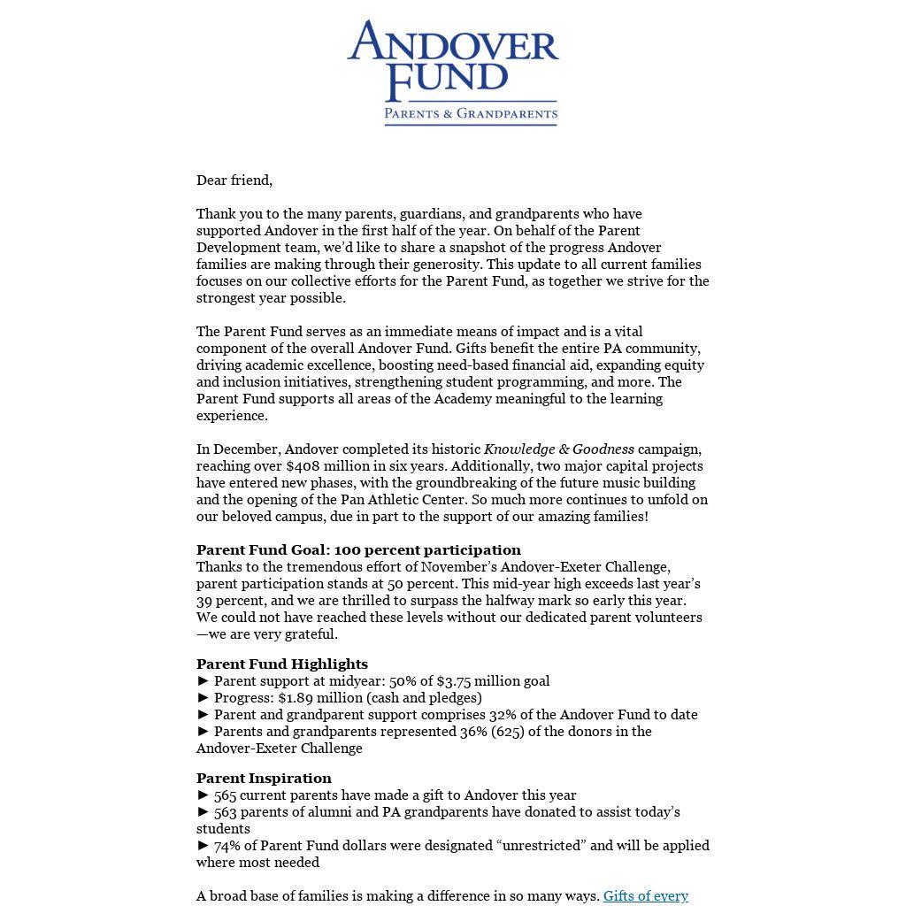 Thank you to the many parents, guardians, and grandparents who have supported Andover in the first half of the year. On behalf of the Parent Development team, we’d like to share a snapshot of the progress Andover families are making through their generosity. This update to all current families focuses on our collective efforts for the Parent Fund, as together we strive for the strongest year possible.