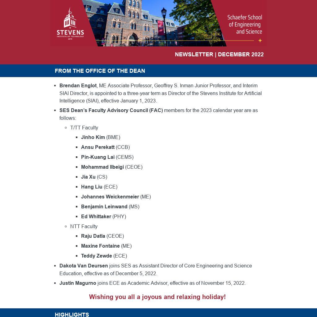 - Dakota Van Deursen joins SES as Assistant Director of Core Engineering and Science Education, effective as of December 5, 2022.